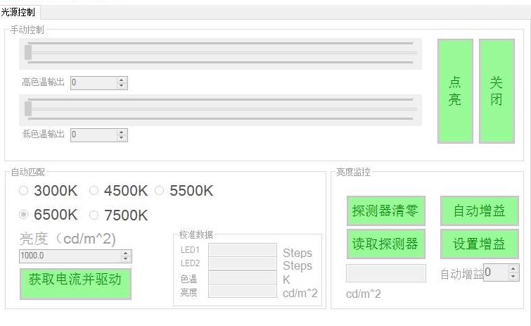 系統(tǒng)軟件界面如下圖。軟件界面清晰直觀,可手動調(diào)節(jié)LED的電流大小,也可按照步數(shù)輸入期望的數(shù)值,實現(xiàn)精細(xì)調(diào)節(jié),實際調(diào)節(jié)精度遠(yuǎn)大于2星等。