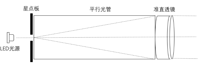 星光模擬器由LED光源,星點(diǎn)板,平行光管,準(zhǔn)直透鏡,驅(qū)動電源,控制軟件等組成。通過調(diào)節(jié)LED的驅(qū)動電流實現(xiàn)不同級別的亮度輸出,從而實現(xiàn)不同星等亮度要求。