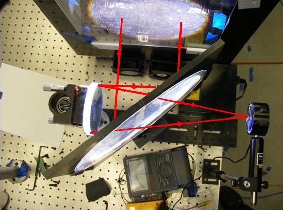 在系統(tǒng)的核心,一個(gè)2.5 kW的氙弧燈被用來收集帶有球形后反射器的燈罩的光。準(zhǔn)直角是通過包含菲涅耳透鏡系統(tǒng)的復(fù)雜光學(xué)組件獲得的。