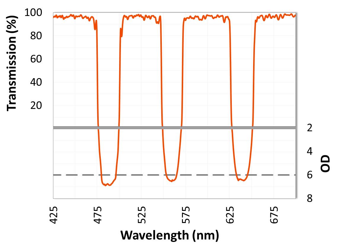 ULTRA系列多陷波濾光片可以設(shè)計成在帶之間具有比OD8更大的截至深度,**的截至陡度和高達(dá)98%的透過率。它們非常適用于需要同時阻斷多條激光線的應(yīng)用。