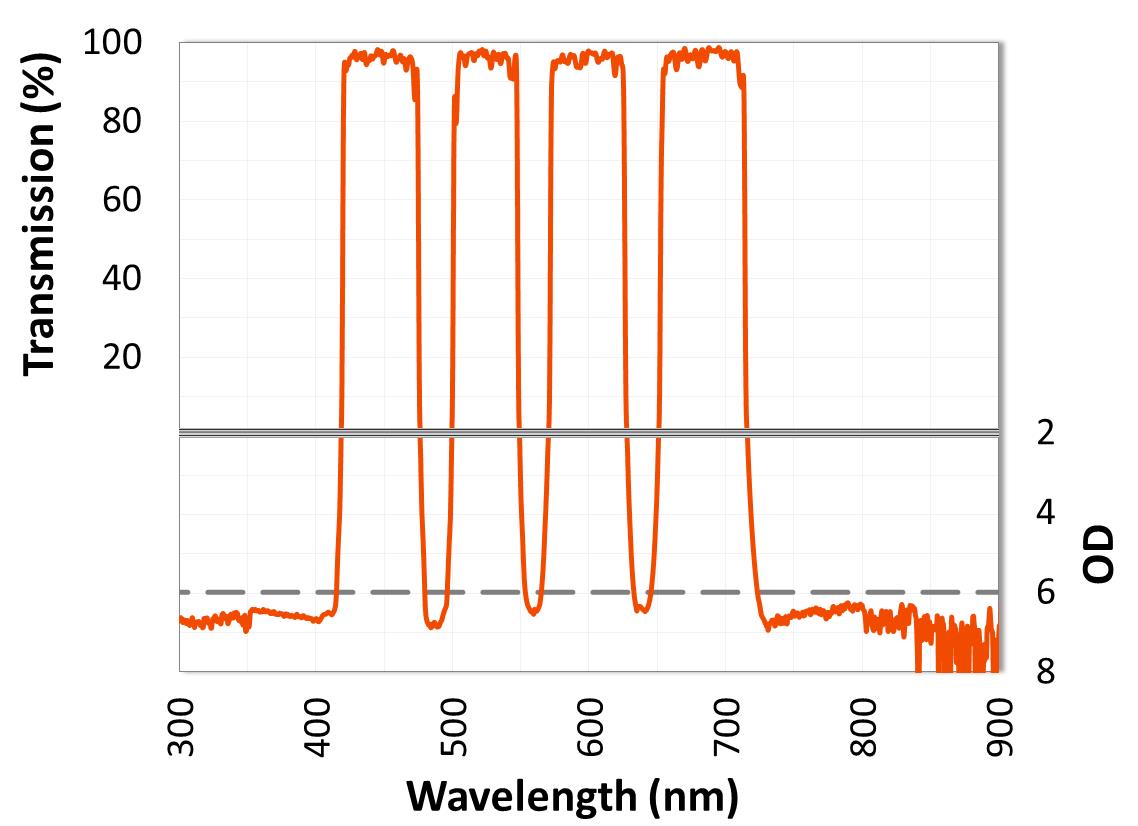 ULTRA系列多頻帶通濾光片可以設(shè)計為10個以上的透過波段,波段之間的OD值大于8,超高的截至陡度,高達98%的透過率。 它們非常適合用作熒光技術(shù)中的激發(fā)或發(fā)射濾光片,要求在單個樣本中同時檢測多個熒光團。
